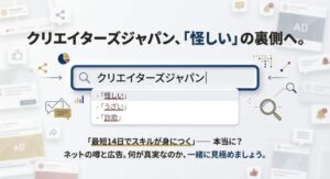Googleなどの検索エンジンで「クリエイターズジャパン」と入力すると、サジェスト(予測変換)に「怪しい」や「うざい」といったネガティブな単語が表示されることがあります。これから申し込もうとしている人にとっては不安の種ですが、これには明確な理由があります。