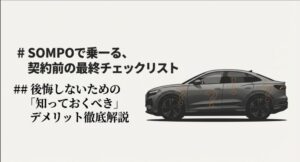 それでもやはり、「KINTO(トヨタ車)ではなく、SOMPOで乗ーるで輸入車に乗りたい」という方はいるでしょう。その熱意は尊重されるべきです。その場合は、契約前、あるいは契約更新時に「オープンエンド方式」のリスクを正しく理解し、コントロールすることが求められます。